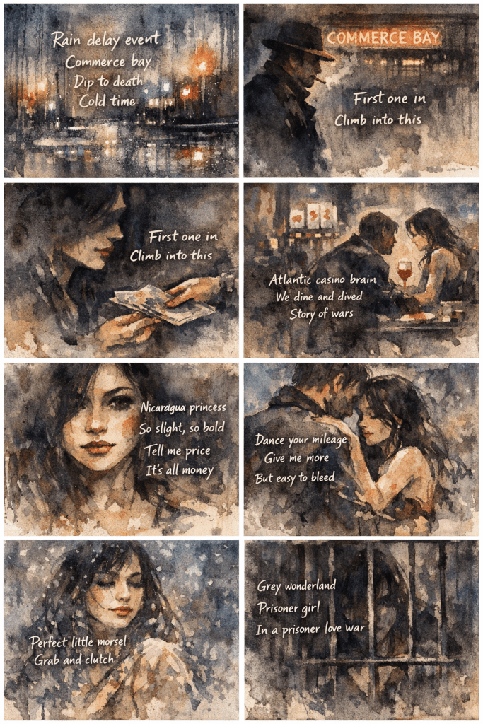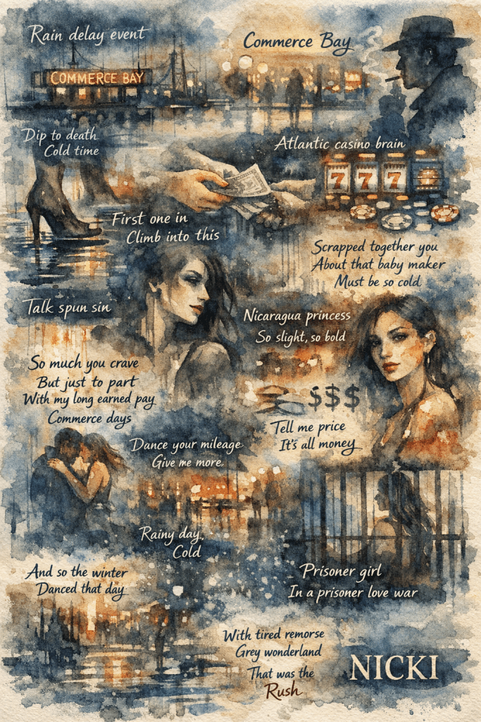 Nicki Rain delay event/Commerce bay/Dip to death/Cold time/First one in/Climb into this/Talk spun sin/Let me tell you/What I do for you/So much you crave/But just to part/With my long earned pay/So that was then/Commerce days/Atlantic casino brain/Just what you see/We dine and dived/Story of wars/Story of holds/You told me you/Scrapped together you/About that baby maker/Must be so cold/Nicaragua princess/So slight, so bold/Tell me price/It’s all money/I must have seemed/Together laced up/But easy to bleed/So we talked/And right on up/Dance your mileage/Give me more/Spread your wealth/Rainy day/Cold/And so the winter/Danced that day/Perfect little morsel/Grab and clutch/That was the/Rush/And so I flee/With tired remorse/Grey wonderland/Prisoner girl In a prisoner love war.