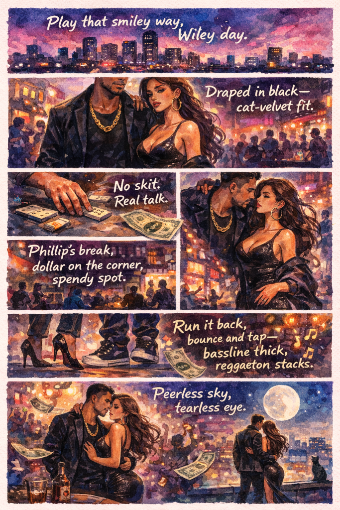 Play that smiley way/Wiley day/Draped in black cat/Velvet fit/No skit/Real talk/Phillip’s break/Dollar on corner/Spendy spot/Run it back/Bounce and tap/Reggaeton stacks/Peerless sky/Tearless eye.